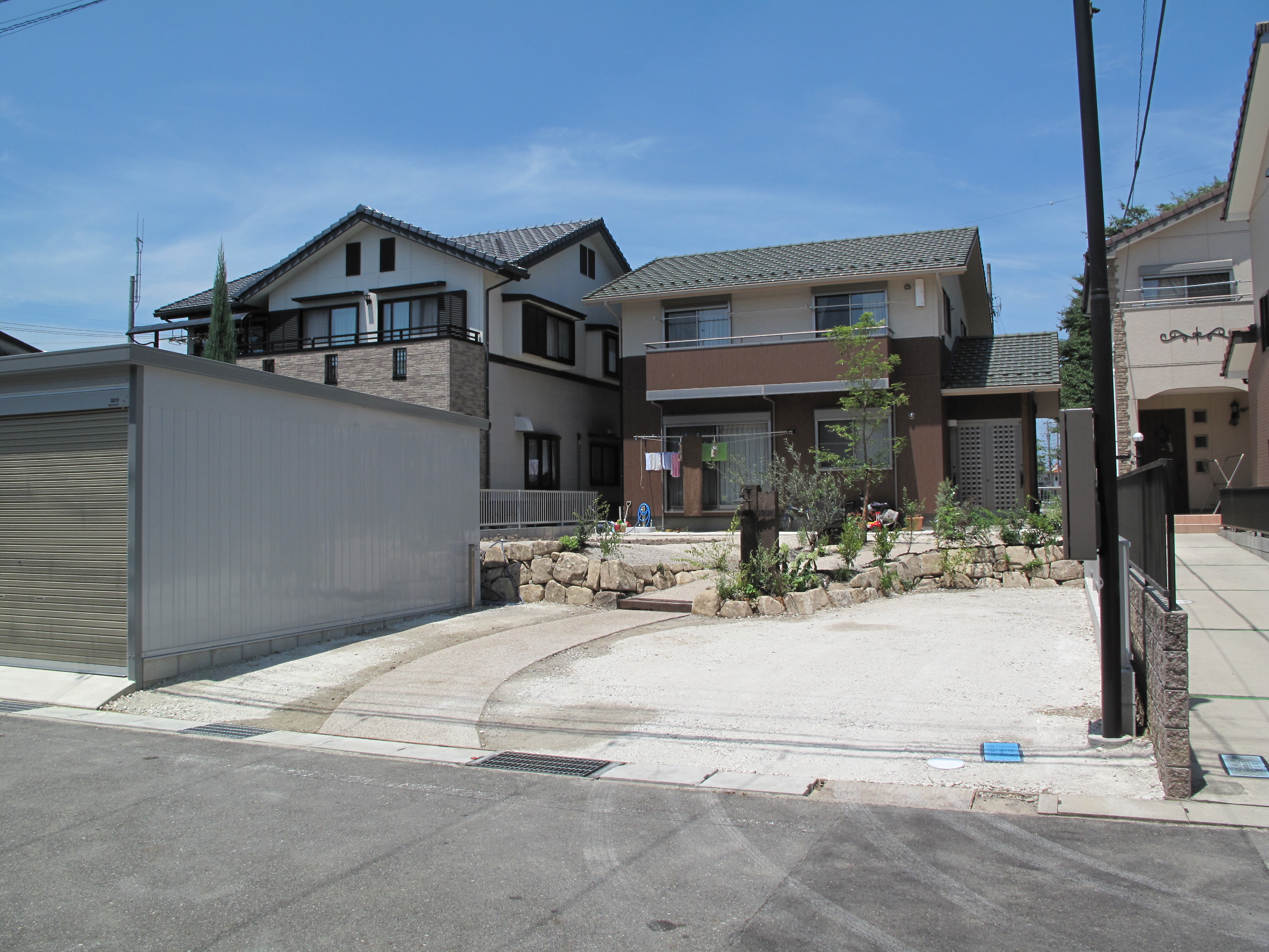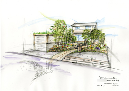 長いアプローチ。平坦なイメージになりがちなので、有効に利用したい。広い敷地なため何をどうしたらいいのか イメージもつかめないので 何とかしてほしいとのご要望でした。