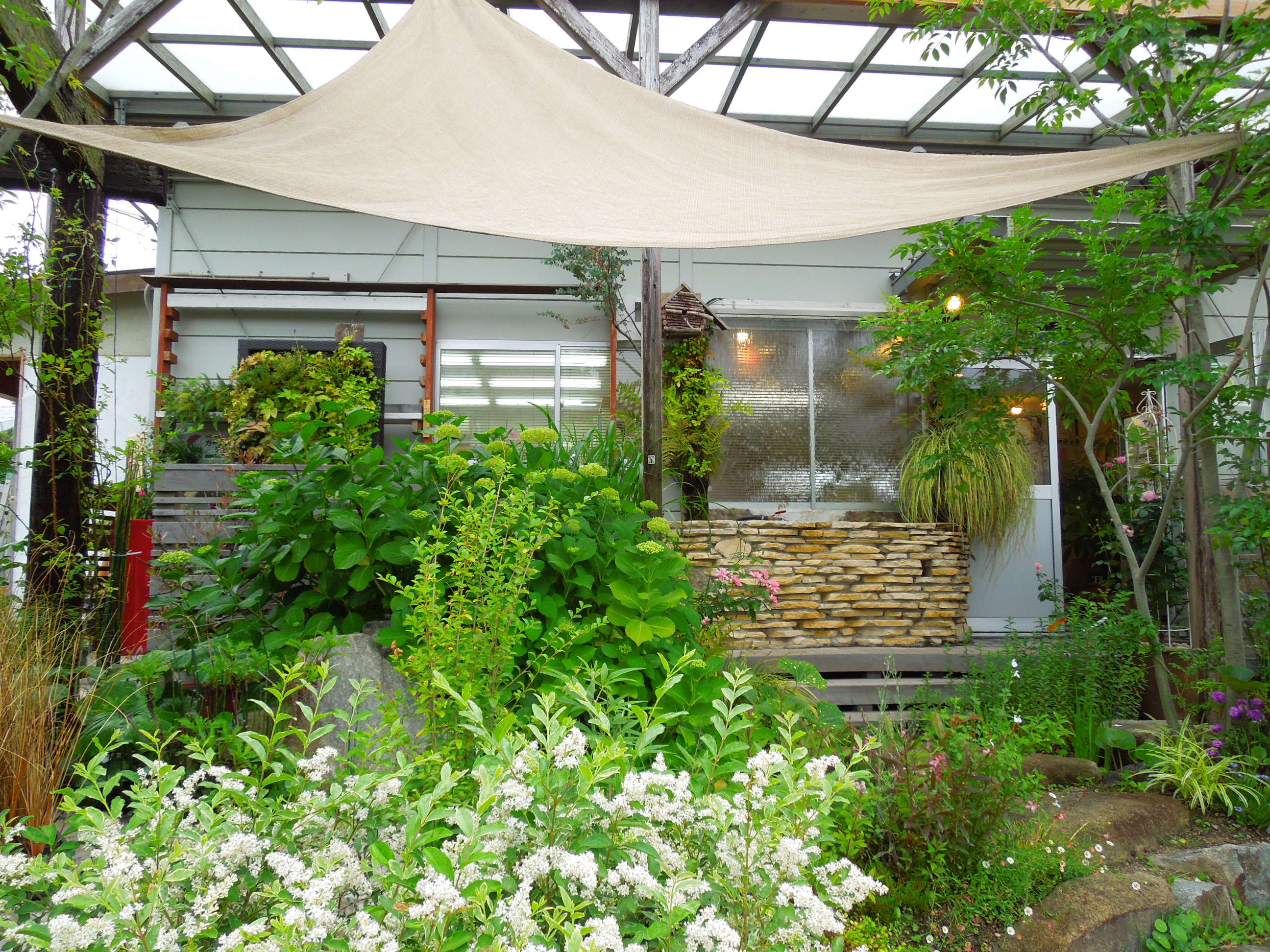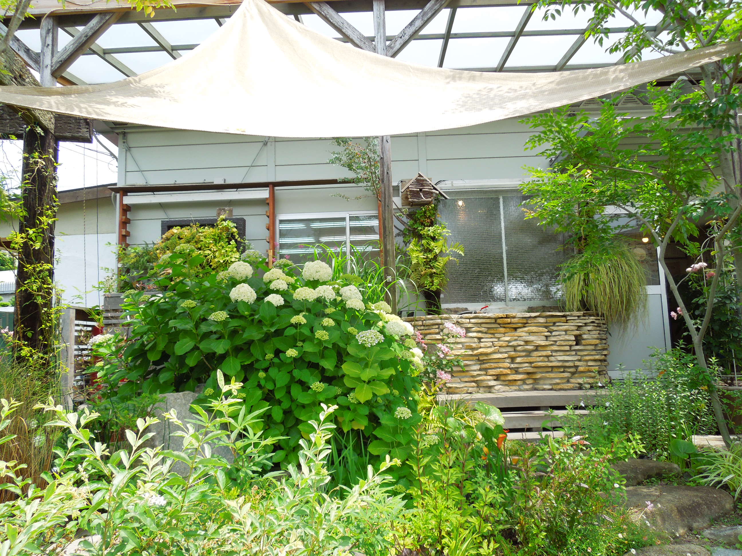 アジサイが、花色を変えました。アナベルはライムグリーンから白へ、オタフクアジサイは青味がかってきました。まだまだボリュームが出そうです。 -
