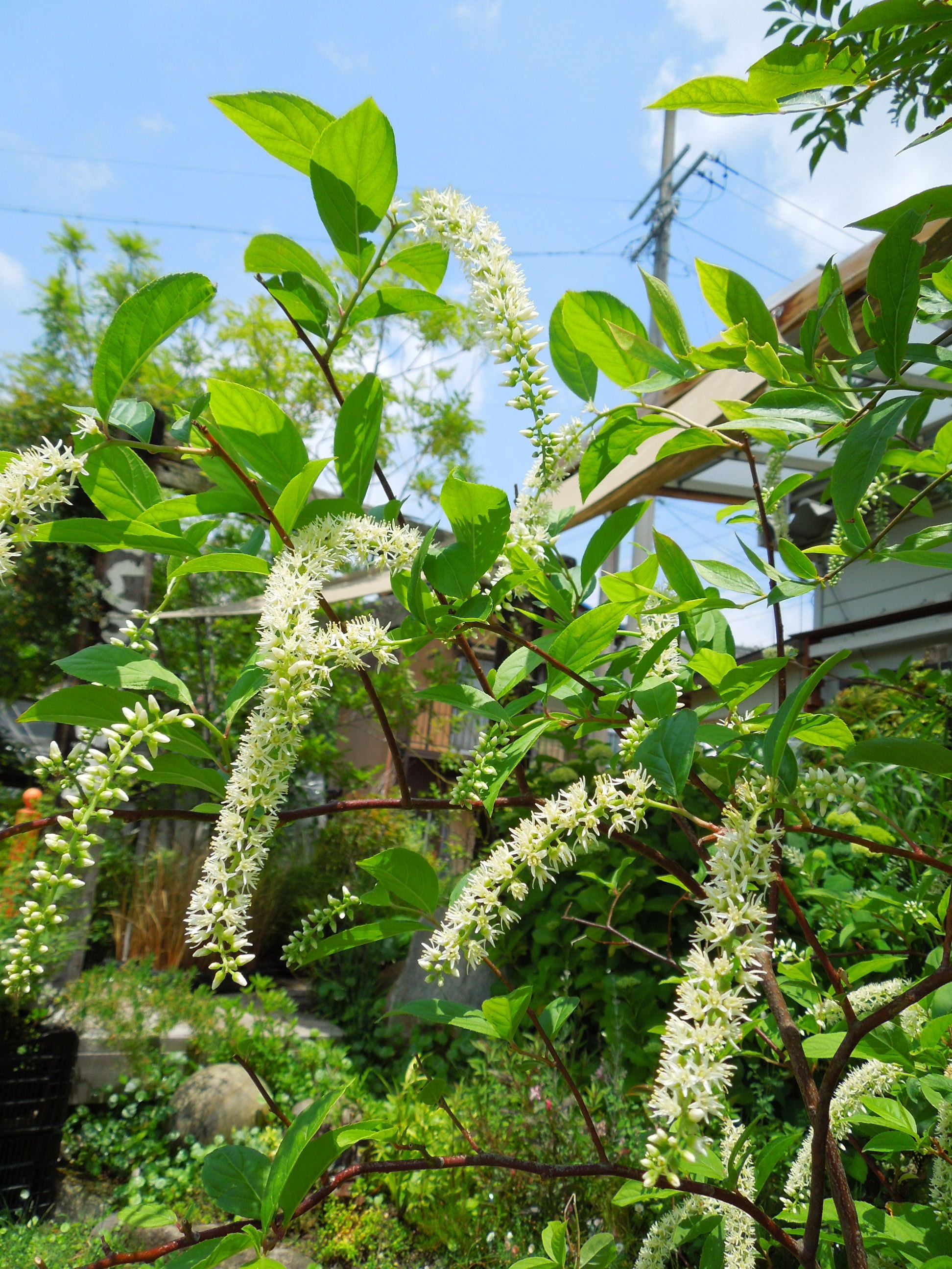 <白く長い花房が可愛いコバノズイナ> 庭先に置いてあるコバノズイナが咲きだしました。 花房が風にゆらゆら揺れながら、ふんわりと香りを漂わせています。 -