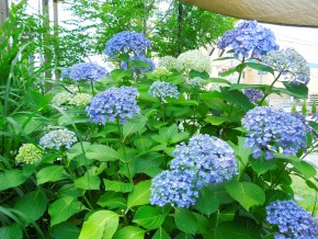 アジサイが、花色を変えました。アナベルはライムグリーンから白へ、オタフクアジサイは青味がかってきました。まだまだボリュームが出そうです。
