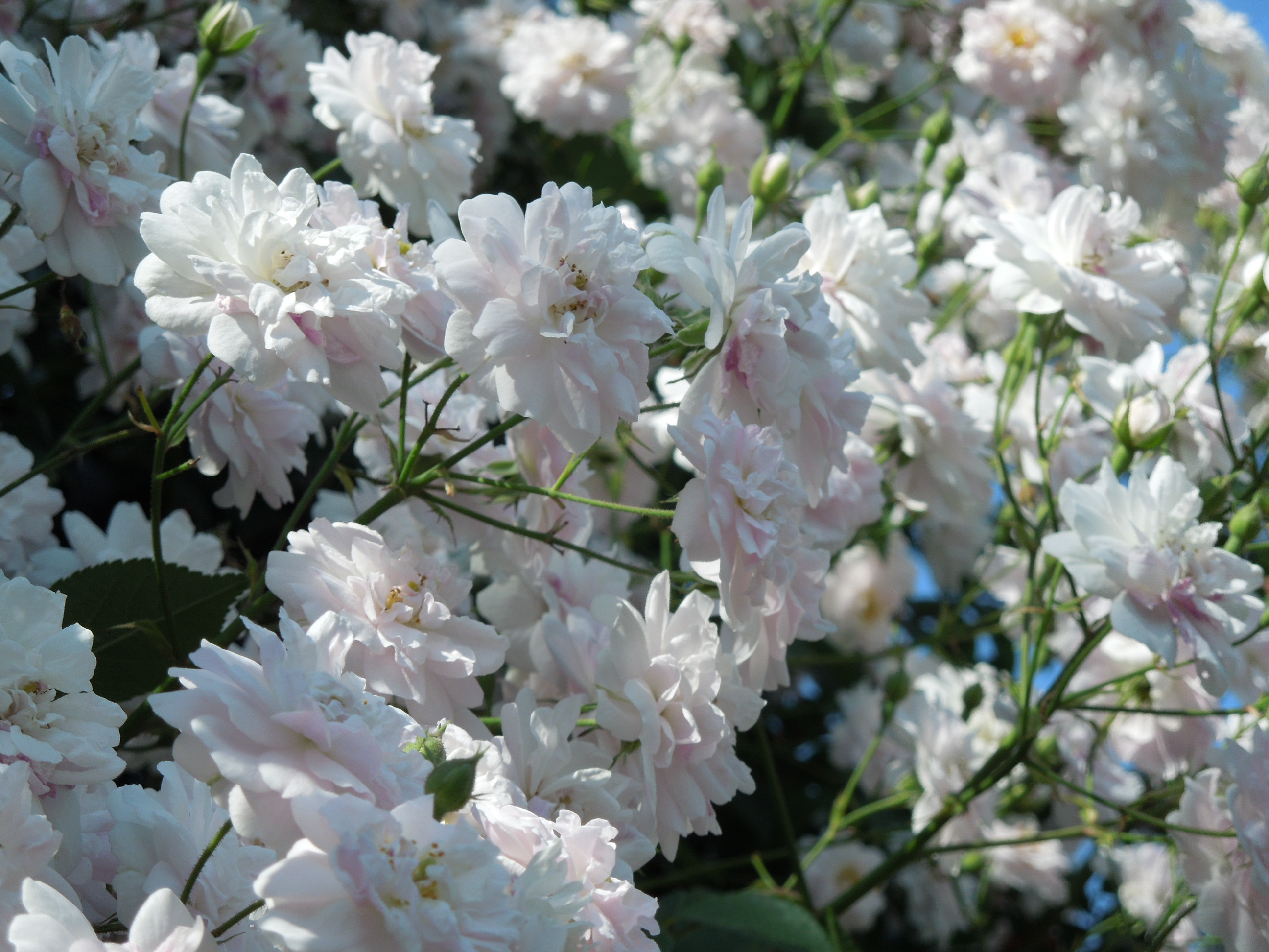壁面のツルバラ、ポールズヒマラヤンムスクが満開になっています。 -