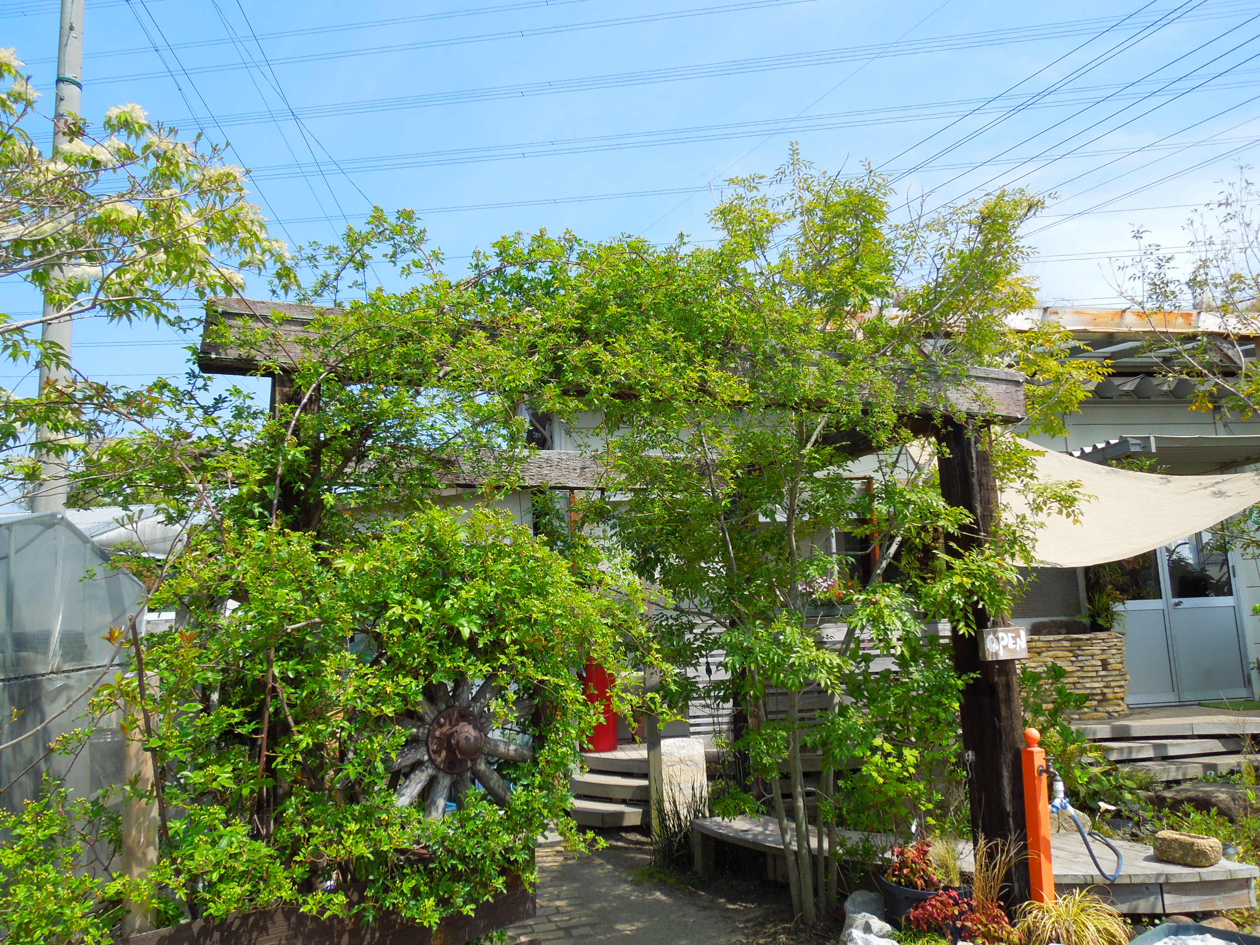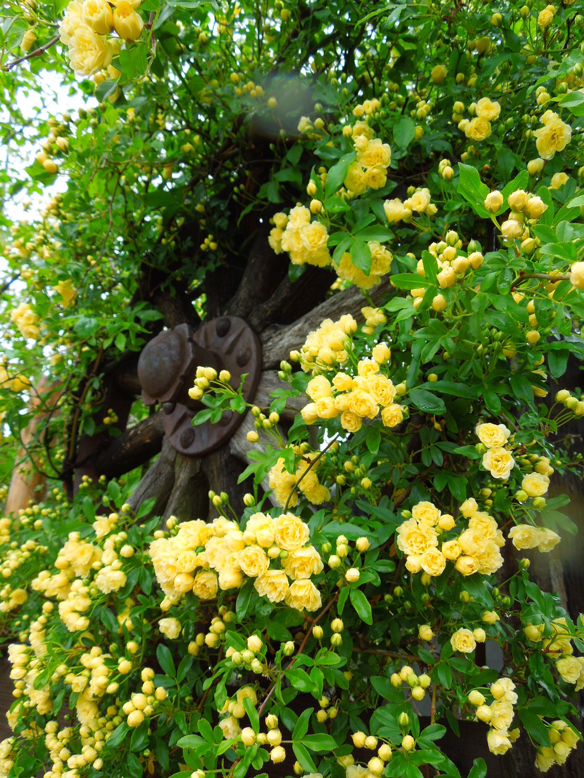枕木パーゴラのキモッコウバラが満開になりました。 -