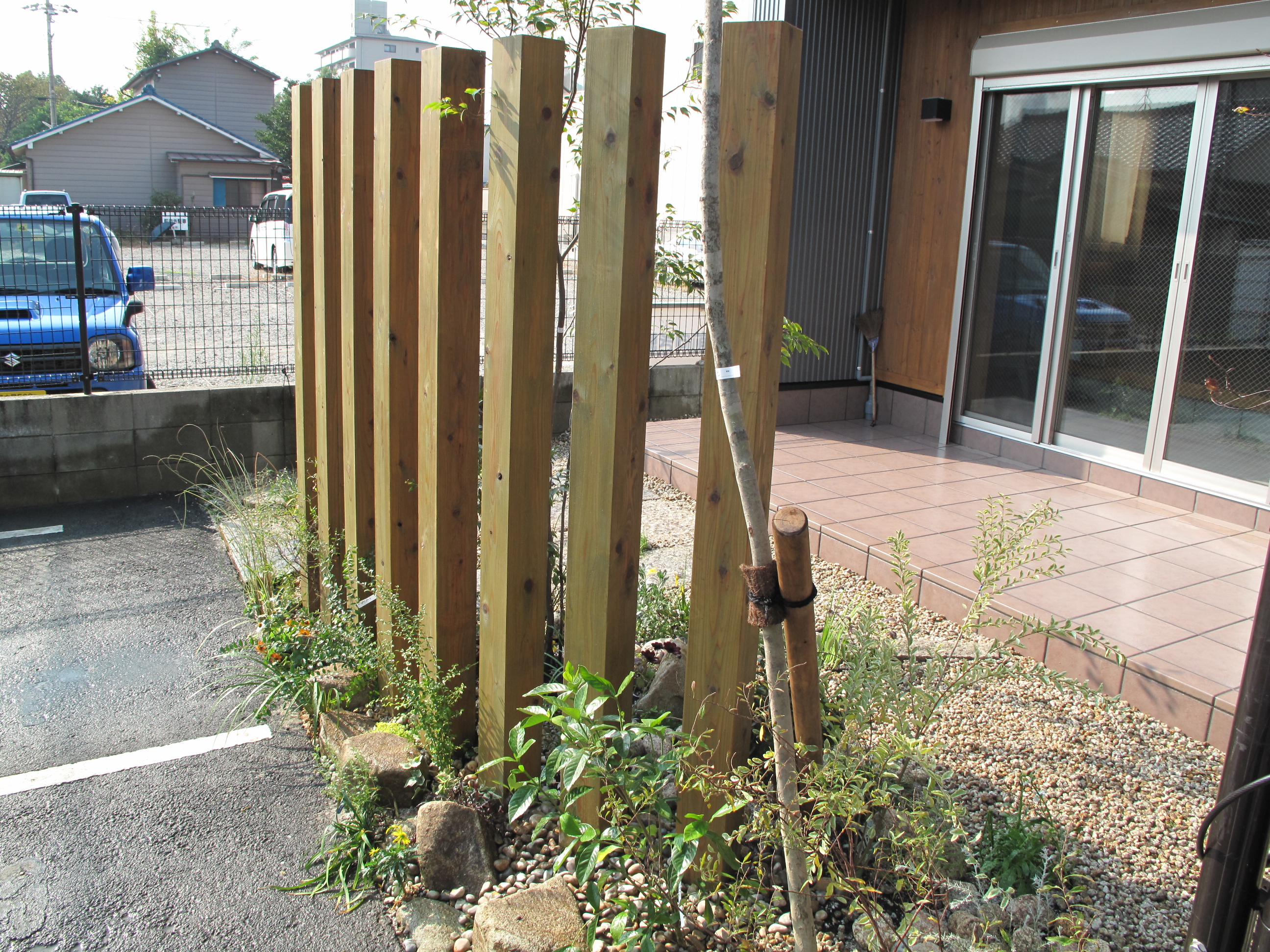 そこで足元に植栽を施しました。植栽が目だって 中の様子が気にならなくなったことがお分かりになりますでしょうか?
