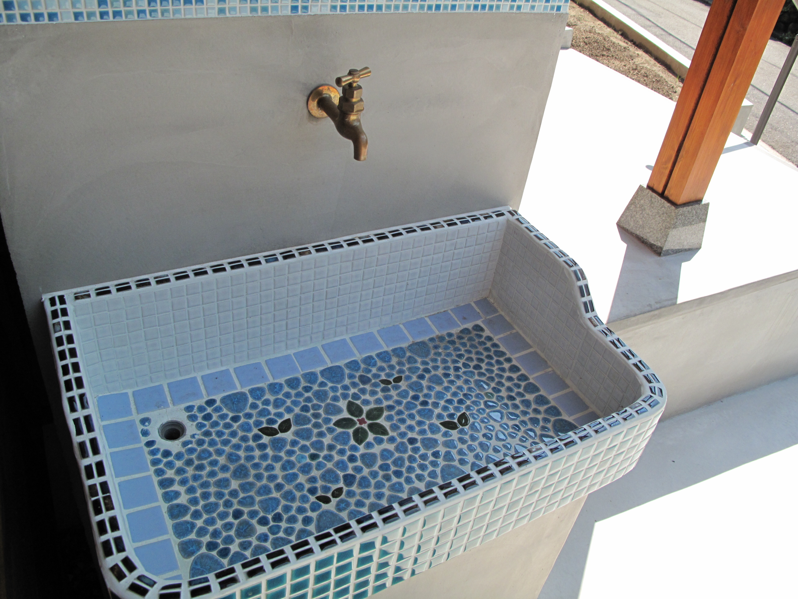 なたたずまい。ただ、道路からは家の中が丸見えです。基本の外構工事は ご友人の方にやってもらったそうです。長いスロープなど老後のこともきちんと考えられています