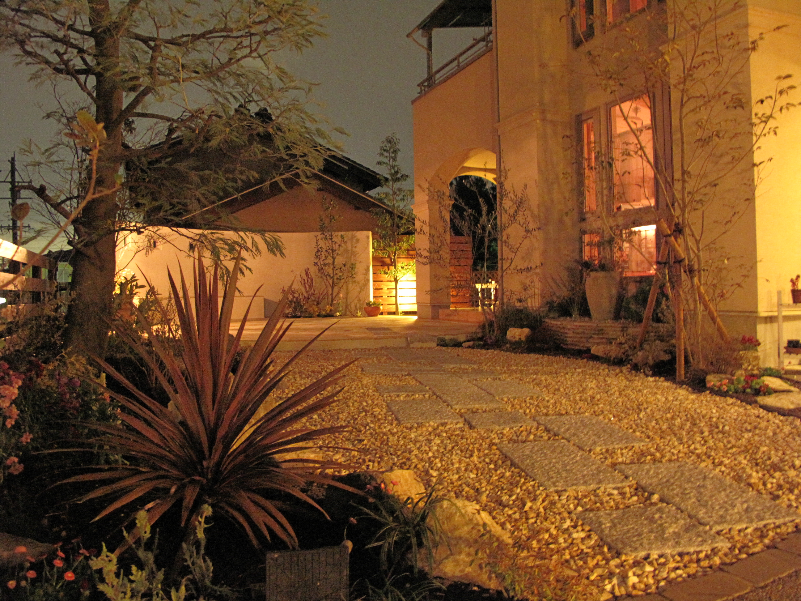 今では、奥さまの趣味のフラダンスの練習を、お仲間でゆったりと人目を気にせずに楽しめるガーデンに生まれ変わりました。もちろん、夜間のBBQもゆったりと楽しめます。
