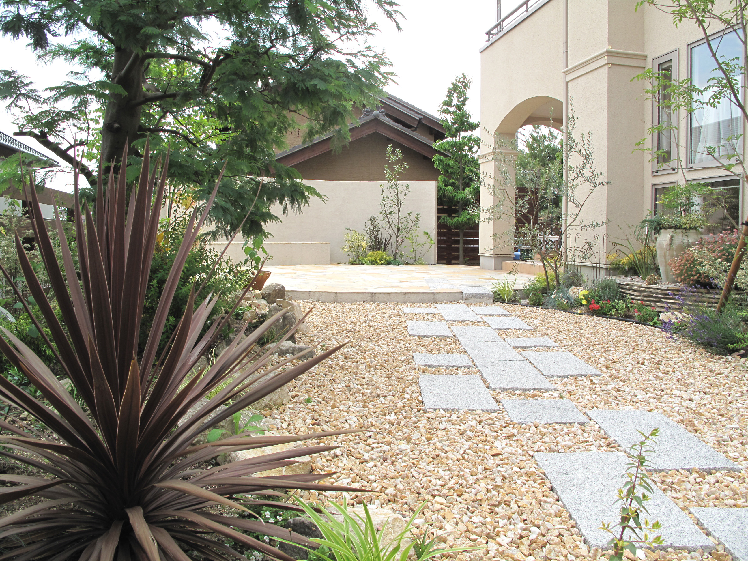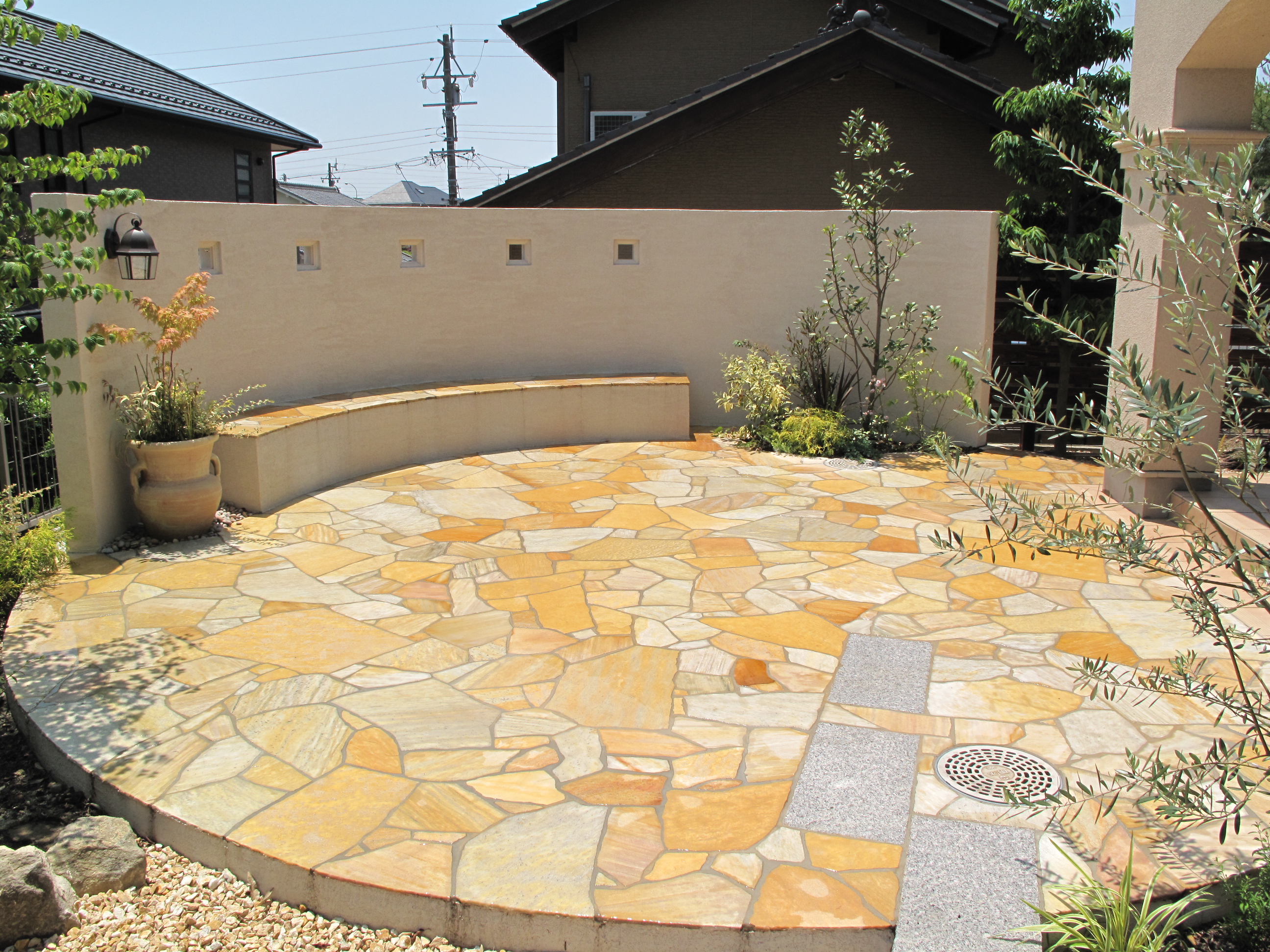 将来、どんな形にでもリフォームしやすいようにハイパーテーション、石張り部以外は砂利敷きとし、使用用途が変わっても 構造物が作りやすい設計としています。