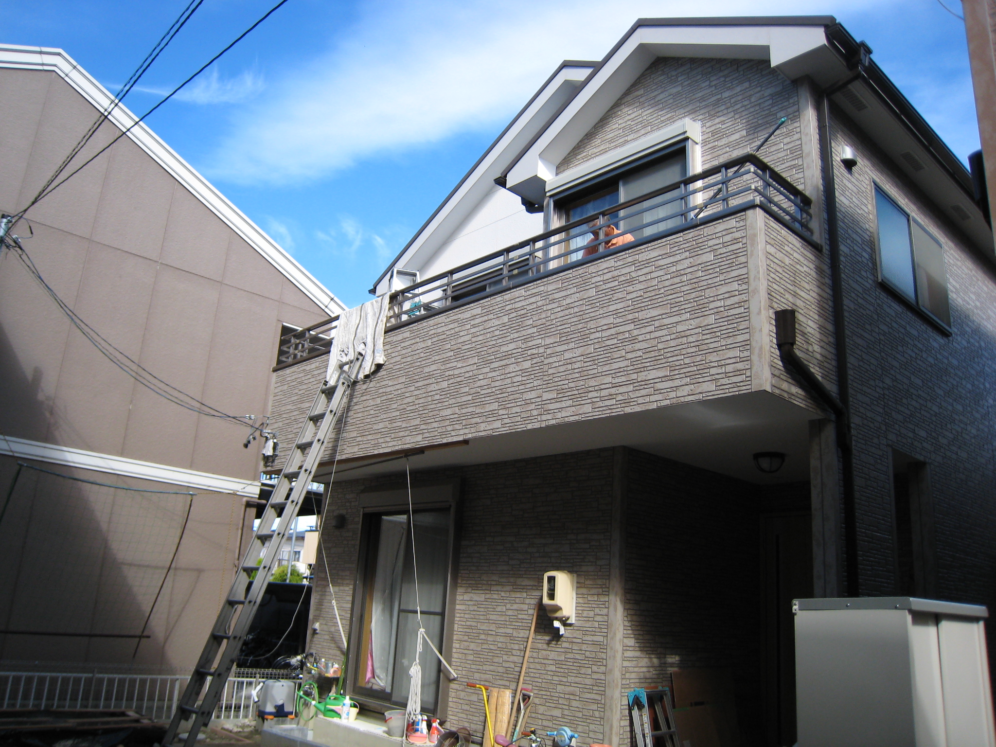 施工状況です。お客様にできる限り、ご迷惑をかけないように外からの作業となります。どうしてもはしご等がかけられない場合のみ、お家の中を通らせて頂きます。