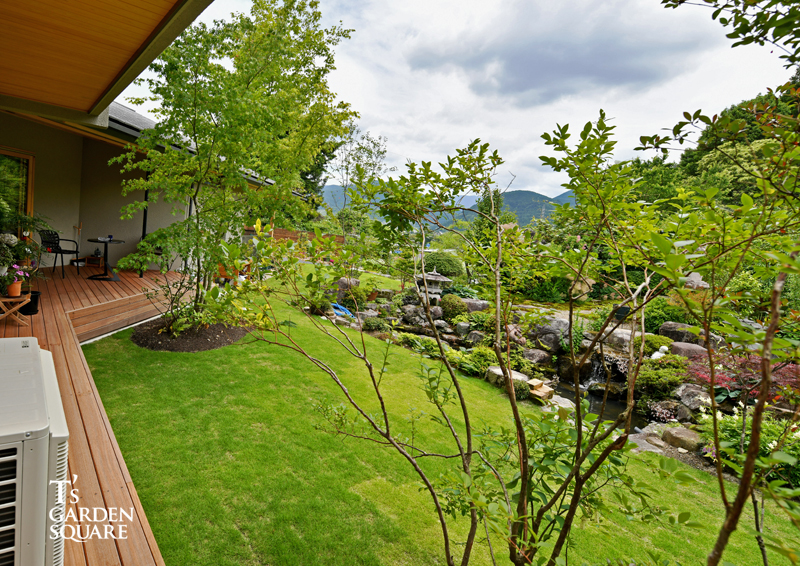 様々な木々と 芝ガーデンで洋風の設えに変身しました。