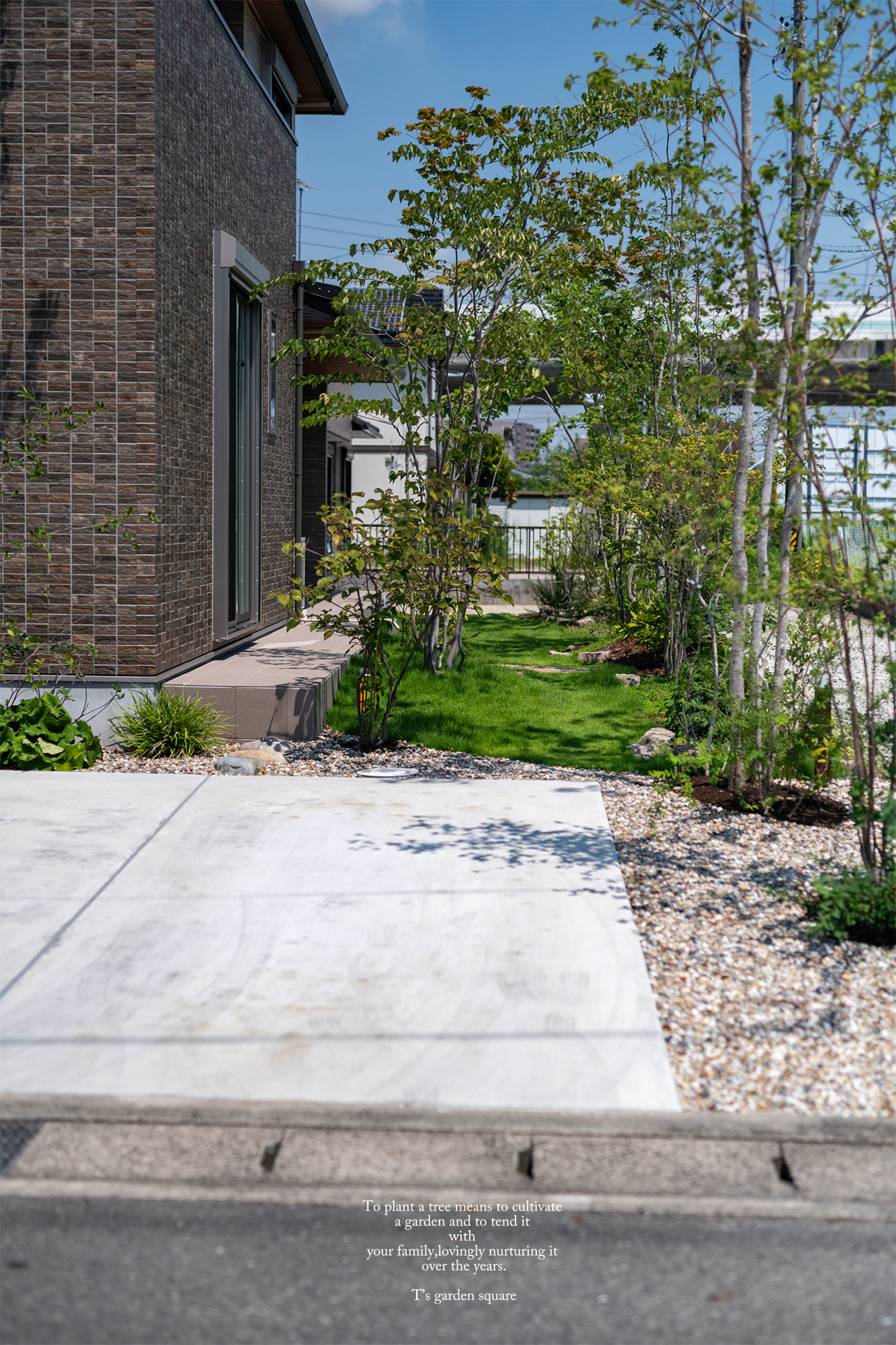 玄関が丸見えだったためシンボリックで樹形の美しいモミジを配置することで玄関が見えにくく落ち着いた雰囲気に